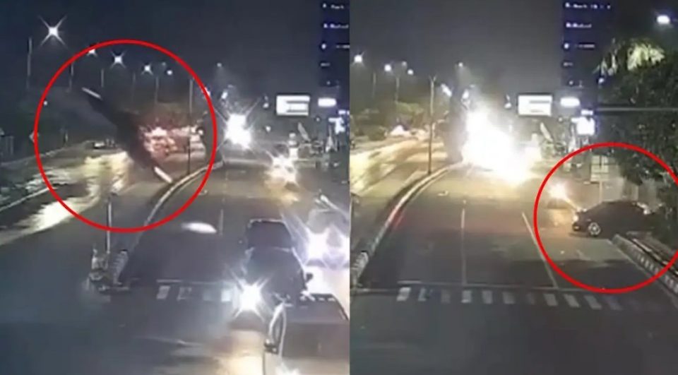 Βίντεο δείχνει τη στιγμή που το πολυτελές αυτοκίνητο εκσφενδονίστηκε από την ημιτελή αερογέφυρα και έπεσε στον δρόμο. Για καλή τύχη του οδηγού, η BMW προσγειώθηκε με τον προφυλακτήρα τη στιγμή που μόλις είχαν απομακρυνθεί δύο αυτοκίνητα και μία μοτοσικλέτα.