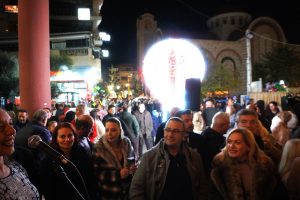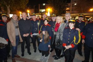 Αμέσως μετά ξεκίνησε η αντίστροφη μέτρηση και το χριστουγεννιάτικο δέντρο φωτίστηκε υπό τους ήχους της φιλαρμονικής, που έπαιξε το τραγούδι «Ω Έλατο» και τα κάλαντα των Χριστουγέννων.