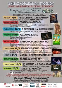 Από την Κυριακή 7 Σεπτεμβρίου έως την Κυριακή 28 Σεπτεμβρίου η «καρδιά» του Πολιτισμού χτυπά στο Δήμο Κορδελιού – Ευόσμου και στην ταράτσα του Πολυλειτουργικού Κέντρου – Θέατρο «Μίκης Θεοδωράκης» (Οδός Μοναστηρίου– Παρατσίκογλου 1, Ελευθέριο Κορδελιό), φιλοξενώντας ένα πλούσιο πρόγραμμα πολιτιστικών δράσεων που αναδεικνύουν και φωτίζουν τη σύγχρονη πολιτιστική δημιουργία.