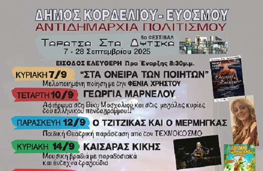 Για πέμπτη συνεχή χρονιά το Φεστιβάλ «Ταράτσα στα Δυτικά» “ανοίγει πανιά” για ένα ξεχωριστό φθινοπωρινό ταξίδι, επιφυλάσσοντας για το κοινό της πόλης μοναδικές βραδιές πολιτισμού κάτω από αστέρια, με μουσικές συναυλίες, θεατρικές παραστάσεις και εικαστικά δρώμενα που διοργανώνει με ελεύθερη είσοδο ο Δήμος Κορδελιού-Ευόσμου, δια της Αντιδημαρχίας Πολιτισμού & Εθελοντισμού.