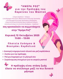 Με στόχο να στείλει το μήνυμα ότι η πρόληψη στο χώρο της υγείας αποτελεί την πλέον υπεύθυνη στάση και σώζει ζωές, ο Δήμος Κορδελιού – Ευόσμου διοργανώνει δύο ενημερωτικές εκδηλώσεις για την πρόληψη του καρκίνου του μαστού.