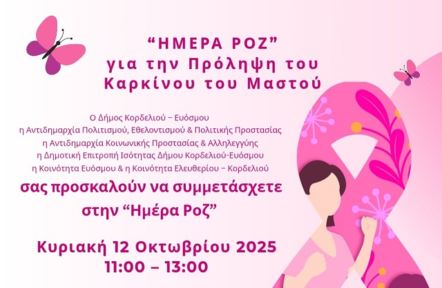 Οι εκδηλώσεις έχουν τίτλο «Ημέρα Ροζ» και θα πραγματοποιηθούν την Κυριακή 12 Οκτωβρίου, από τις 11:00 π.μ. έως τις 13:00 μ.μ., στην κεντρική πλατεία Ευόσμου και στο θεατράκι του Ελευθερίου – Κορδελιού. Διοργανώνονται δια της Αντιδημαρχίας Πολιτισμού, Εθελοντισμού και Πολιτικής Προστασίας, της Αντιδημαρχίας Κοινωνικής Προστασίας και Αλληλεγγύης, της Δημοτικής Επιτροπής Ισότητας και των Κοινοτήτων Ευόσμου και Ελευθερίου – Κορδελιού.
