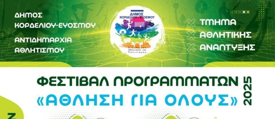 Το Σαββατοκύριακο 14 και 15 Ιουνίου, με εκδηλώσεις που θα περιλαμβάνουν την παρουσίαση γυμναστικών και χορευτικών επιδείξεων από συμμετέχοντα τμήματα, πραγματοποιείται το Φεστιβάλ Άθλησης για όλους, το οποίο αποτελεί ουσιαστικά την τελετή λήξης των χειμερινών προγραμμάτων άθλησης του Δήμου Κορδελιού – Ευόσμου.