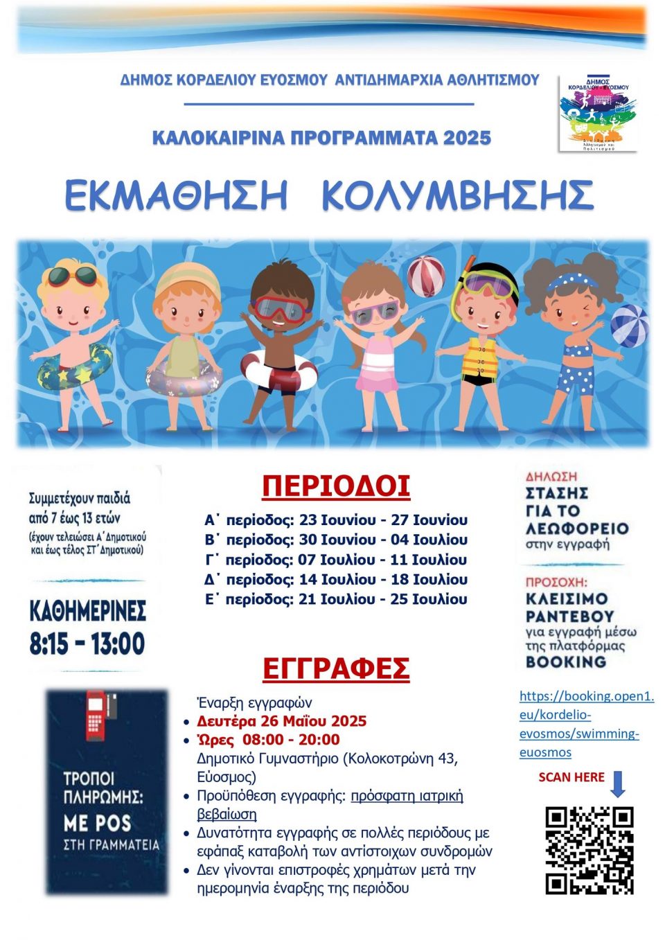 🏊 Ξεκινούν τη Δευτέρα 26 Μαΐου 2025 οι εγγραφές για το πρόγραμμα «Εκμάθηση Κολύμβησης» του Δήμου Κορδελιού – Ευόσμου για τη φετινή καλοκαιρινή περίοδο, στο οποίο συμμετέχουν παιδιά έχουν τελειώσει την Α΄ Δημοτικού και έως τέλος ΣΤ΄ Δημοτικού. Τα μαθήματα θα γίνονται καθημερινά, από τις 8:15 το πρωί έως τις 13:00.