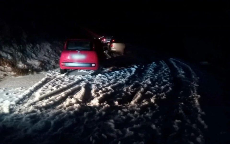 Η κατάσταση έγινε ιδιαίτερα επικίνδυνη όταν, λόγω της υπερβολικής ολισθηρότητας του δρόμου, ένα επιβατικό αυτοκίνητο στο οποίο επέβαιναν τέσσερα άτομα έχασε την πρόσφυση και εξετράπη της πορείας του, καταλήγοντας σε γκρεμό.