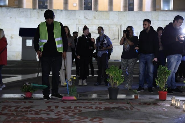 Στο σημείο βρέθηκε η ομάδα “Μέχρι τέλους”, η οποία ανέλαβε δράση καθαρισμού στο μνημείο για τα Τέμπη στη Βουλή, δείχνοντας με έμπρακτο τρόπο σεβασμό και μνήμη για τα θύματα.