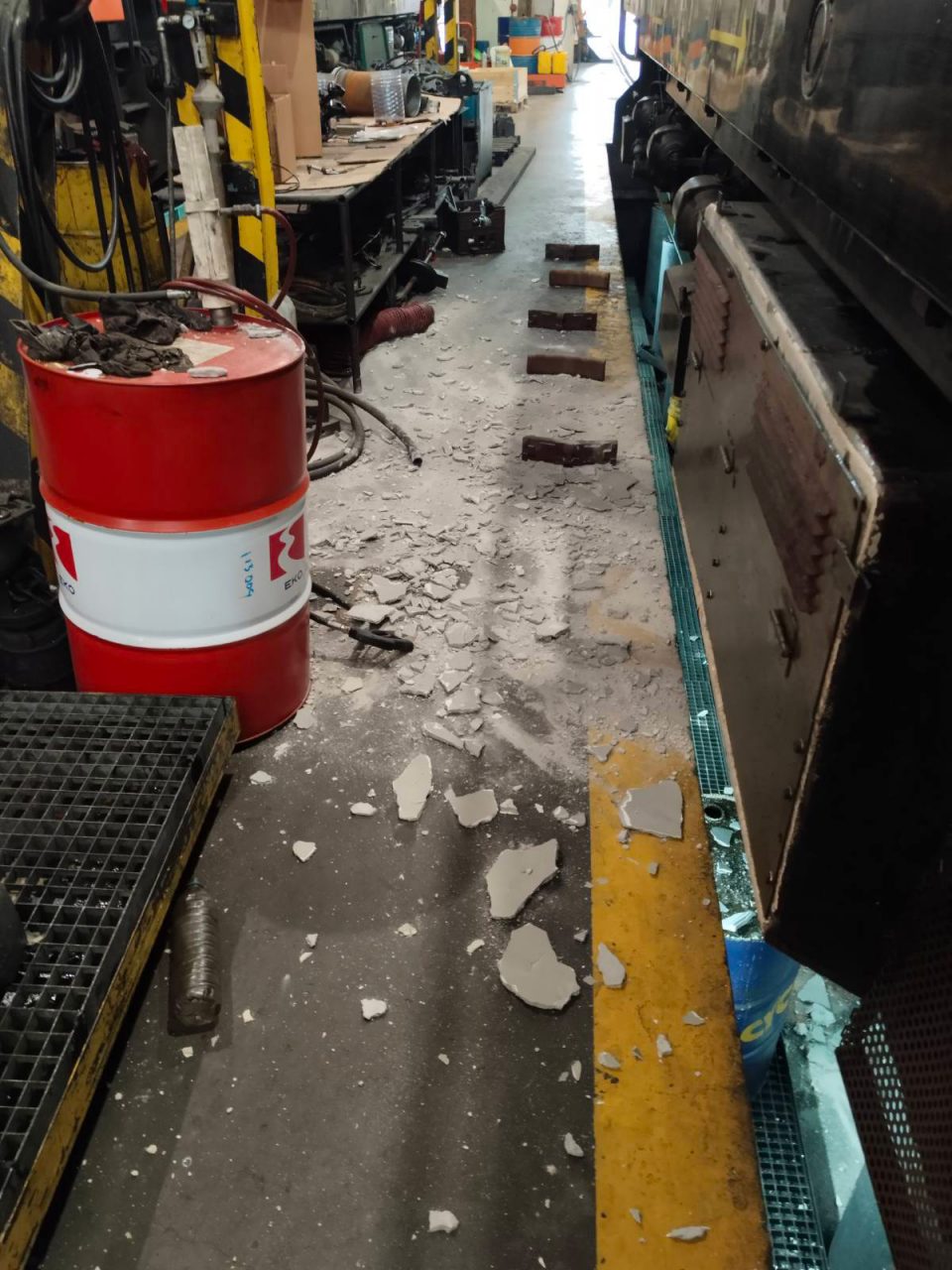 Ειδικότερα, στο κεντρικό μηχανοστάσιο της Θεσσαλονίκης, αποκολλήθηκε ένα μεγάλο κομμάτι σοβά από το ταβάνι στον χώρο όπου βρίσκονται τα κανάλια εργασιών συντήρησης των μηχανών και από τύχη δεν τραυματίστηκε εργαζόμενος, καθώς εκείνη τη στιγμή δεν εκτελούνταν εργασίες.