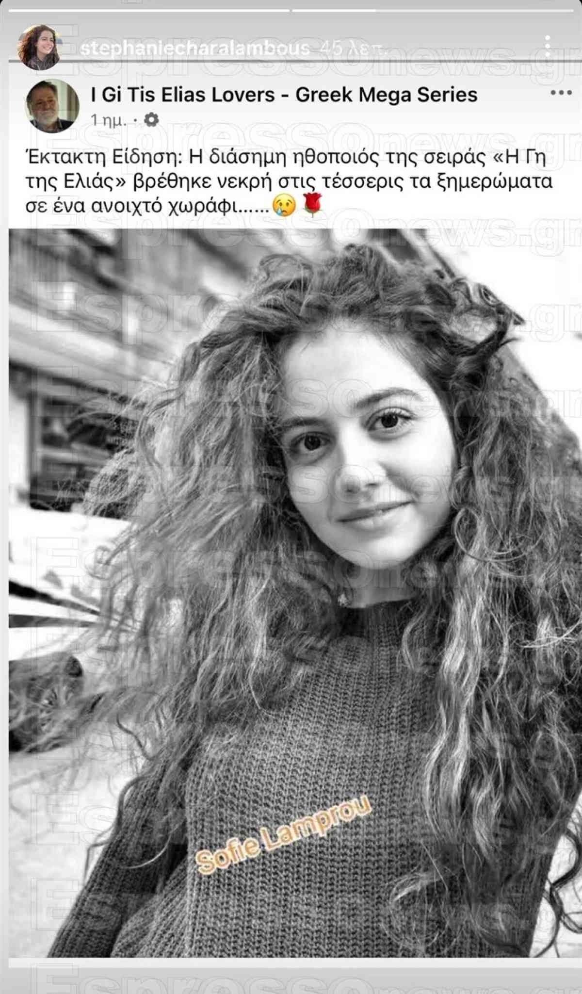 «Η διάσημη ηθοποιός της σειράς “Η γη της ελιάς” βρέθηκε νεκρή στις τέσσερις τα ξημερώματα σε ένα χωράφι», ανέφερε η λεζάντα στη σχετική ανάρτηση.